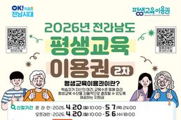 네이처 아트랩 관리자 기자 | 자연과 예술이 어우러진 배움의 전당, <네이처 아트랩 평생교육원>이 전라남도 도민들의 평생학습을 지원하는 '2026년 평생교육이용권(바우처)'의 공식 사용 기관으로 최종 등록되었다. 이에 따라 강진군민을 비롯한 전라남도 도민들은 비용 부담 없이 국가의 지원을 받아 <네이처 아트랩 평생교육원>의 수준 높은 치유·예술 전문 교육을 수강할 수 있게 되었다. 1인당 연간 35만 원 지원, 4월 20일부터 2차 신청 접수 '평생교육이용권'은 학습자가 자신의 여건과 관심사에 따라 자율적으로 평생교육 프로그램에 참여할 수 있도록 정부와 지자체가 수강료 및 교재비를 지원하는 제도다. 전라남도에 주민등록을 둔 19세 이상 성인이라면 누구나 신청할 수 있으며, 선정 시 1인당 연간 35만 원의 혜택이 주어진다. 이번 2026년 2차 일반 이용권 및 노인·디지털·장애인 이용권 신청은 오는 4월 20일(월) 오전 10시부터 5월 7일(목) 자정까지 전라남도 평생교육이용권 누리집(www.lllcard.kr/jeonnam)을 통해 온라인으로 진행된다. 오프라인 신청은 5월 6일(수) 오후 6시까지 각 시군 평생교육 담당 부서에서 가