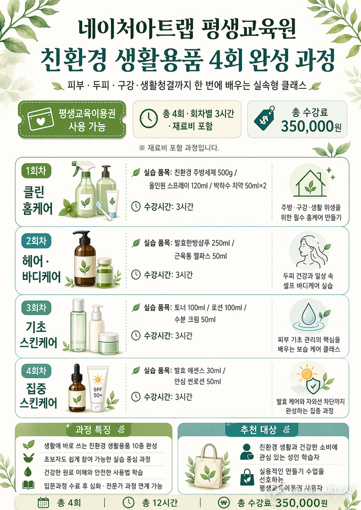 피부부터 주방까지, 4주 만에 끝내는 친환경 홈케어 총 4회차(회당 3시간, 총 12시간)로 구성된 이번 클래스는 초보자도 쉽게 따라 할 수 있는 실습 위주로 진행되며, 일상생활에 바로 적용 가능한 10종의 친환경 제품을 직접 만들어 가져갈 수 있다.