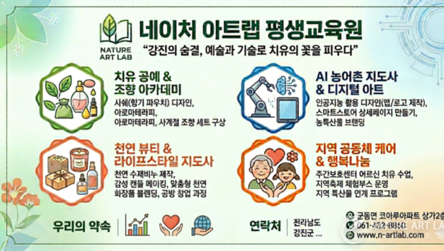 네이처 아트랩 관리자 | 강진의 풍부한 자연과 문화유산을 기록하고, 이를 치유와 교육의 가치로 승화시키려는 **<네이처 아트랩>**이 마침내 언론사 부설 평생교육원으로 공식 출범하며 강진 교육 문화에 새로운 활력을 불어넣고 있다. <네이처 아트랩>(발행인 최민겸)은 지난 3월 3일, 전라남도 강진교육지원청으로부터 평생교육시설 설립 신고를 최종 승인받아 '네이처 아트랩 평생교육원'을 공식 개원했다고 밝혔다. 강진군 군동면 백금포길에 자리 잡은 본 교육원은, 단순한 정보 전달을 넘어 독자와 군민들이 직접 참여하고 배우는 '실천적 지식 플랫폼'을 지향한다. 미디어와 교육의 만남, 신뢰도 높은 전문 강좌 마련 언론기관 부설 평생교육원의 가장 큰 장점은 신문이 다루는 깊이 있는 전문 지식을 현장 교육으로 직결시킬 수 있다는 점이다. <네이처 아트랩>은 그간 강조해 온 '건강·치유', '문화·예술', '시민참여', '직업능력'이라는 4대 핵심 가치를 바탕으로 체계적인 커리큘럼을 완성했다. 주요 개설 강좌로는 ▲자연을 담은 치유, 아로마 테라피스트 전문과정 ▲향기로 잇는 세대 공감, 실버 인지 향상 공예(실버아로마공예) 지도사 과정 ▲지구